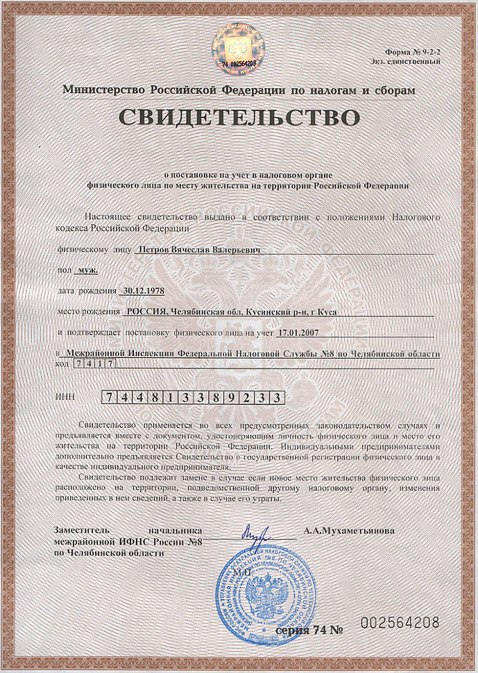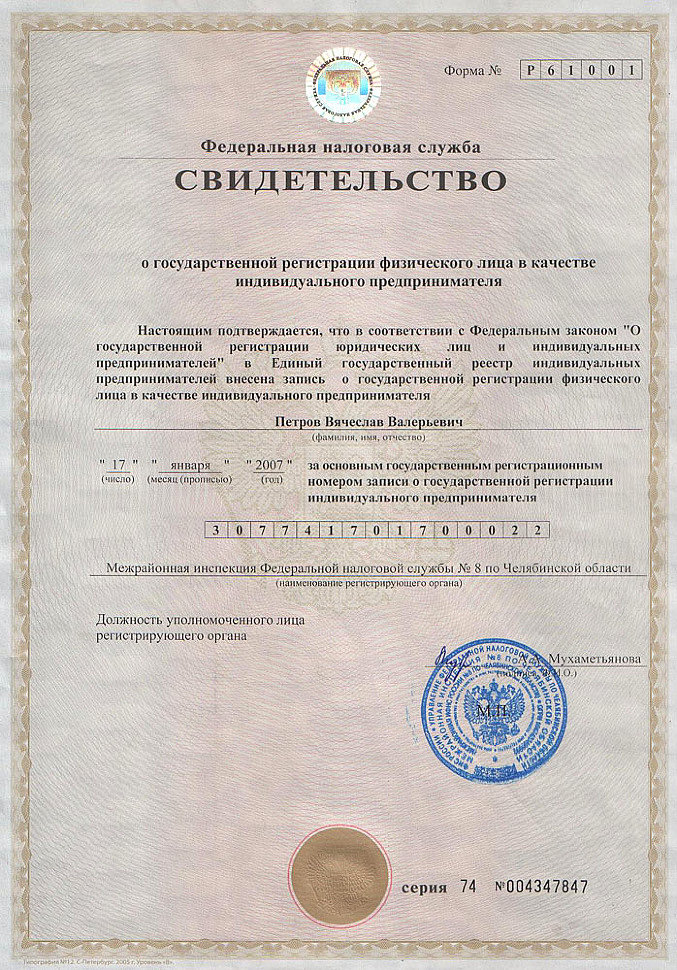 Свидетельство о регистрации ОГРНИП: 307741701700022 от 17.01.2007 г.
